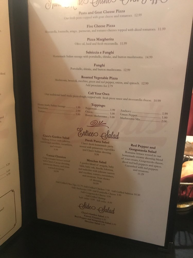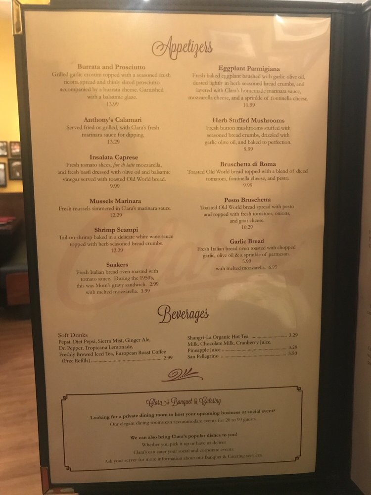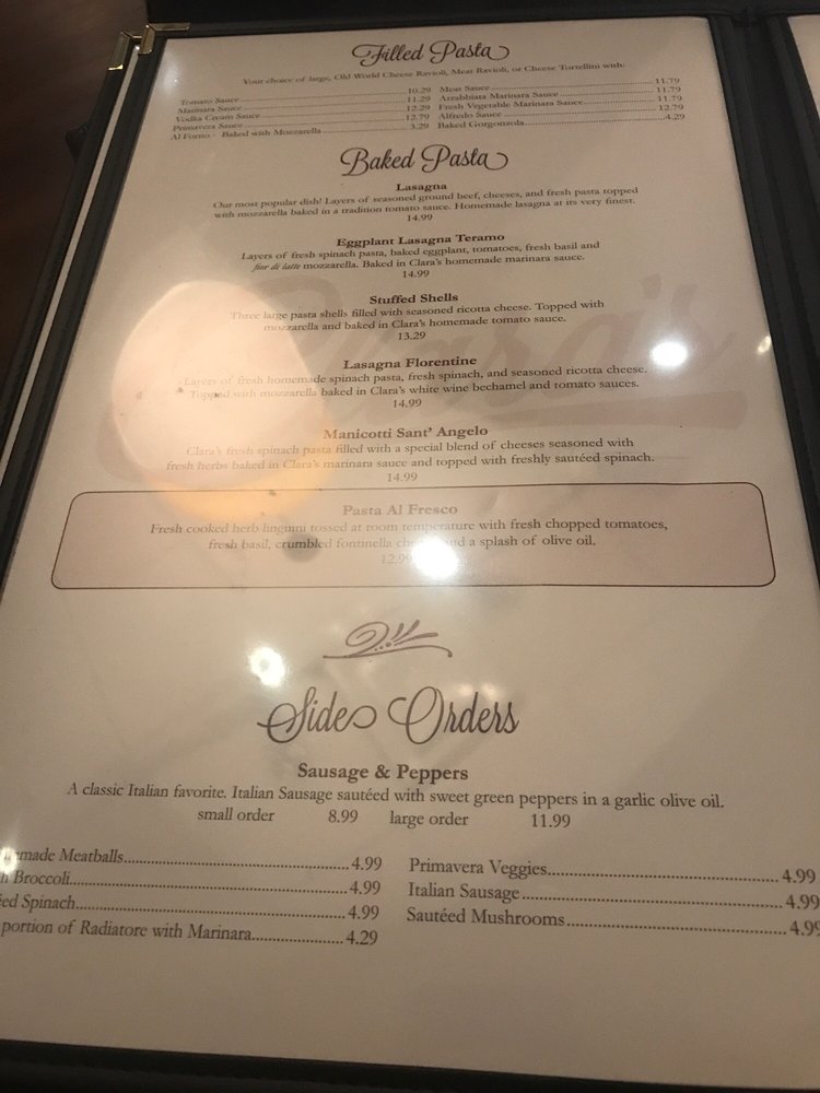 Introducing Clara's, a popular Italian restaurant located in Woodridge, IL. Clara's offers a wide range of amenities such as outdoor seating, catering services, and a full bar. The menu includes appetizers like garlic bread, Anthony's calamari, and bruschetta. Additionally, Clara's offers a variety of sides like sautéed mushrooms, shrimp, and homemade meatballs. For those looking for a lighter option, Clara's entree salads are a perfect choice, including their Claras Garden Salad and Large Caesar Classico. With a diverse menu that caters to vegan and vegetarian preferences, Clara's is sure to please all types of diners. The casual atmosphere, attentive waitstaff, and delicious food make Clara's a must-visit for Italian cuisine lovers.